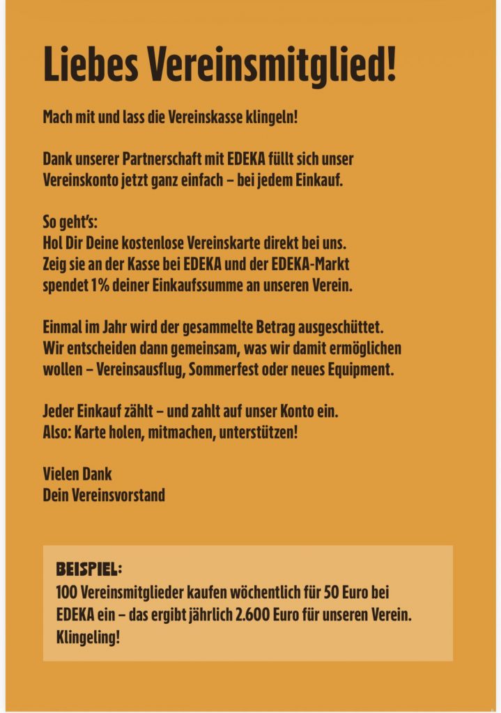 100 Vereinsmitglieder kaufen einmal in der Woche für 50 € ein. Macht bei einer Gutschrift von 1 % schon 2.600 € für das Vereinskonto im Jahr aus.