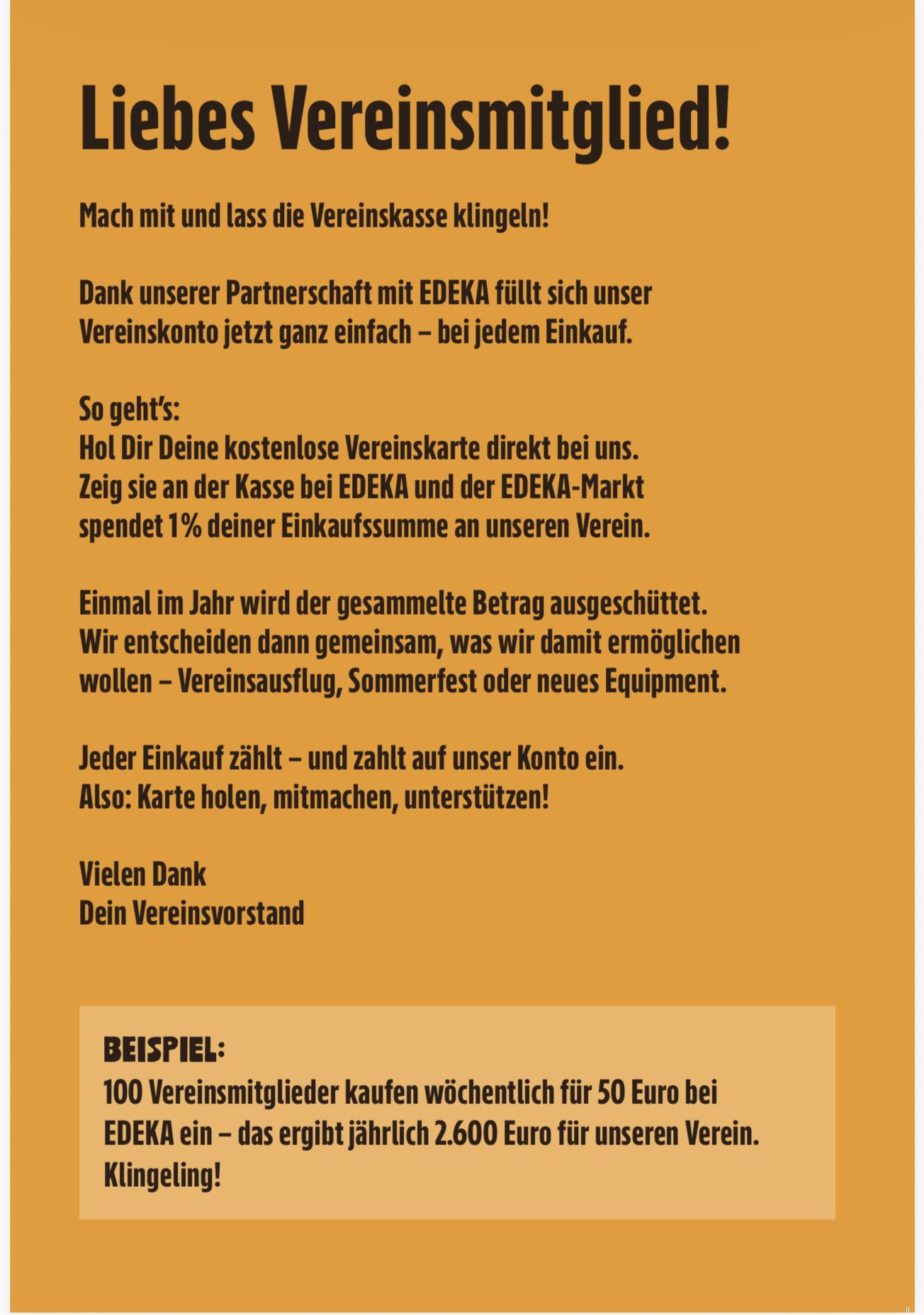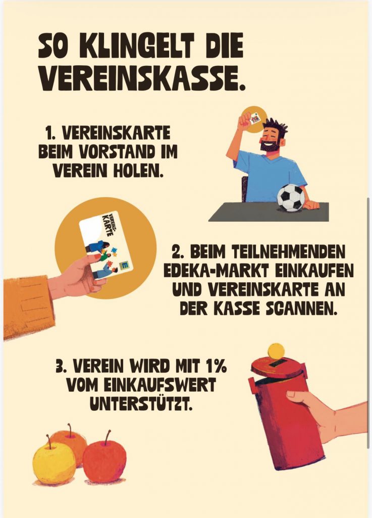 Jedes Vereinsmitglied erhält eine nicht personalisierte Karte, mit der bei jedem Einkauf in unserem EDEKA Driller Markt in Bochum 1 % des Einkaufswertes als Spende auf das Vereinskonto gutgeschrieben werden.